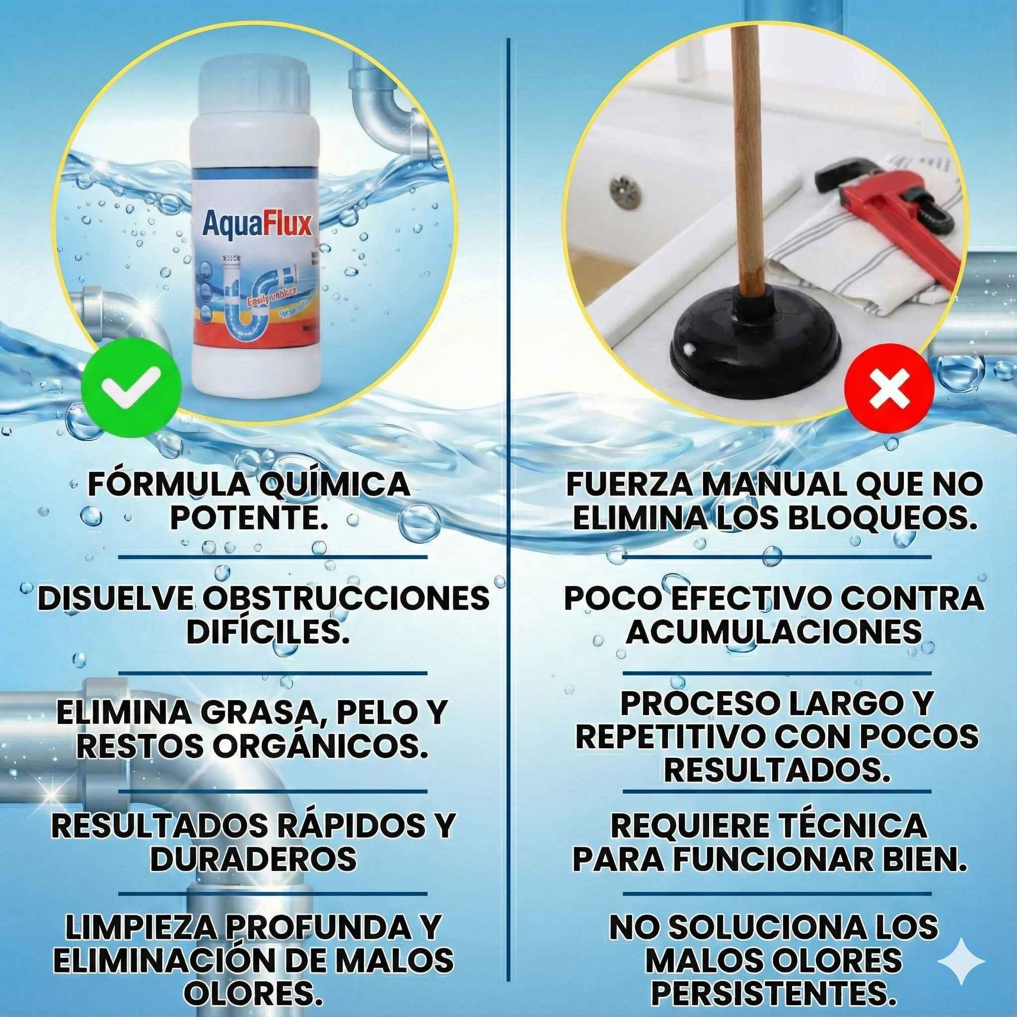 Ese es el primer aviso de que tus cañerías están acumulando grasa, jabón y desechos que pronto se convertirán en un bloqueo total. AquaFlux® elimina de raíz esos tapones invisibles antes de que se conviertan en una reparación costosa. Su fórmula de acción profunda disuelve todo en minutos y elimina los malos olores que invaden tu baño o cocina.