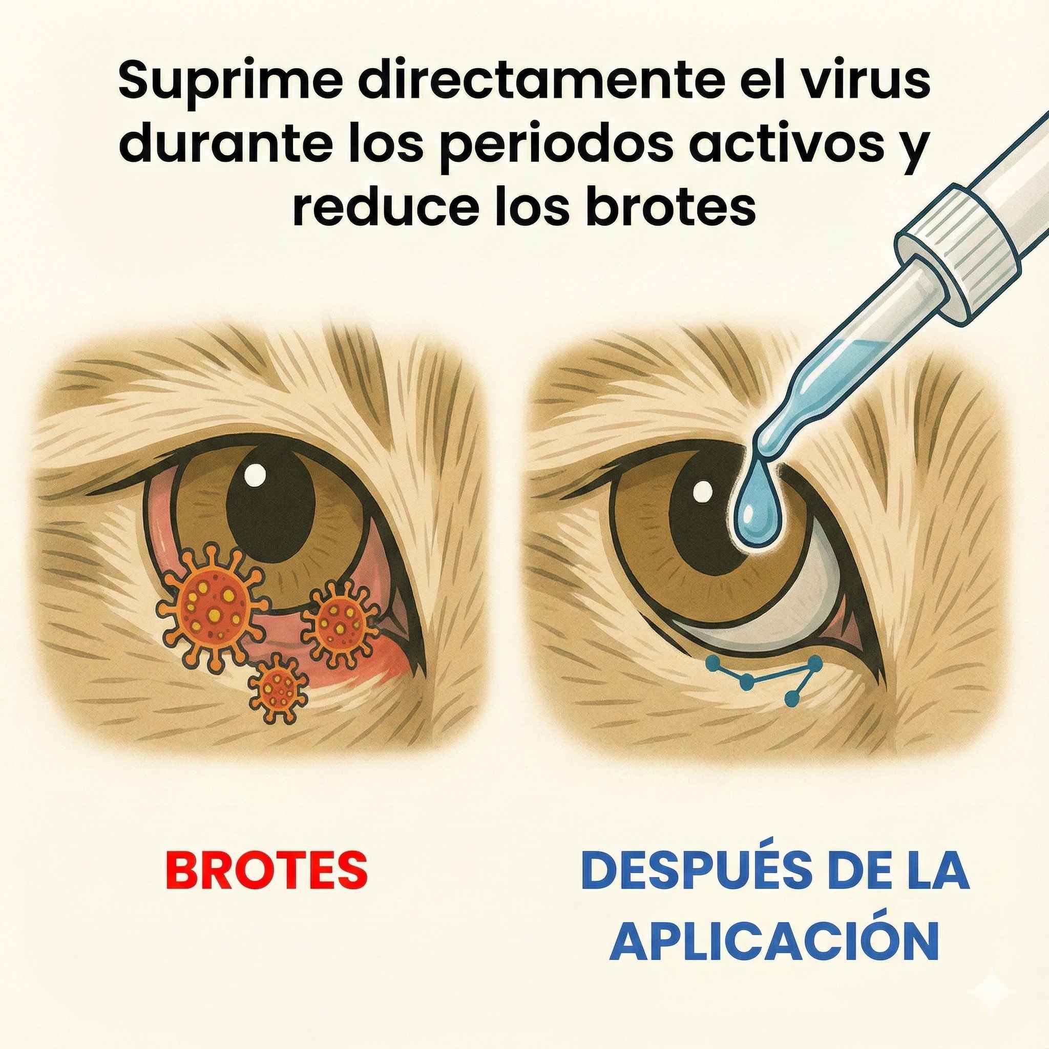 Estas gotas oftálmicas tienen tres efectos: suprimen la actividad viral, crean una barrera protectora ocular y utilizan remedios herbales para reducir la inflamación. Dos veces al día, tan simple como cepillarse los dientes.