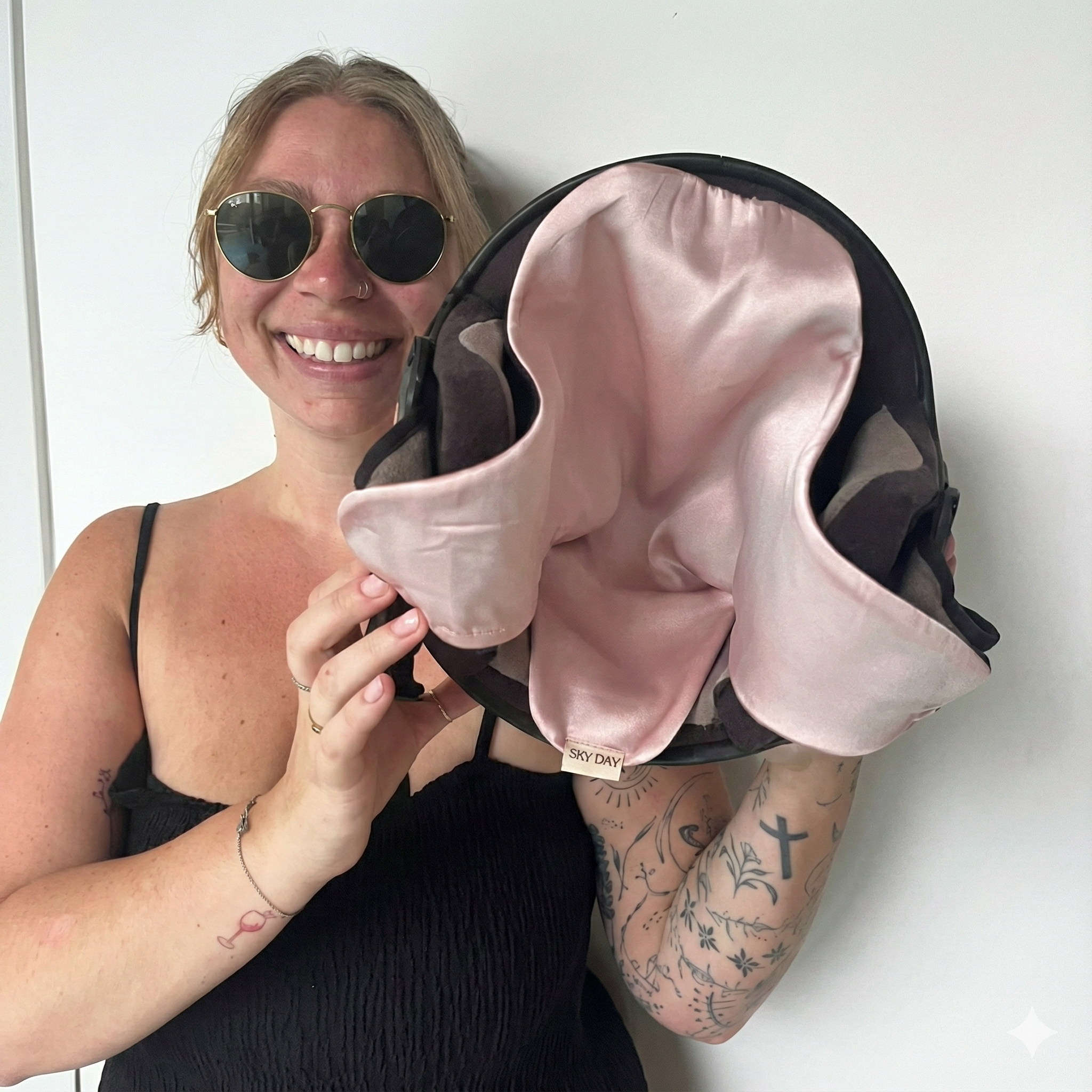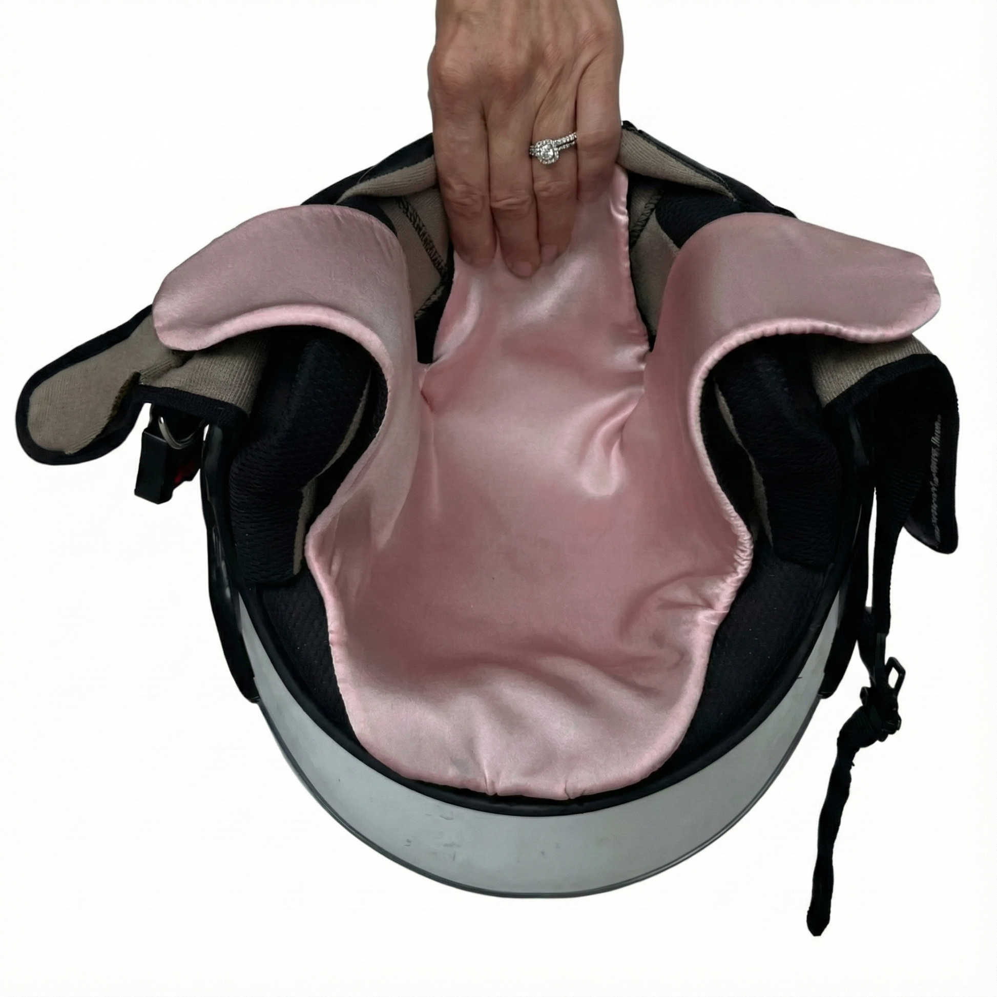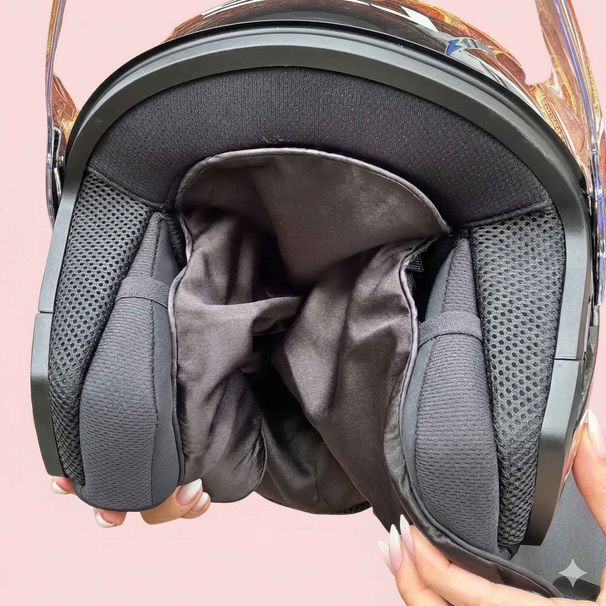 SilkRide™ ✨ tiene un diseño superfino y discreto 🪶 que protege tu cabello 💇♀️ del frizz y la ruptura 🚫, reduce la fricción 🛡️ y lo mantiene suave, sin aplastamiento 😌 y libre de malos olores 🌬️ bajo el casco 🪖.